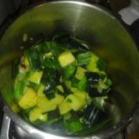 - Je nettoie soigneusement les verts de poireaux, puis je coupe en morceaux. Dans une cocotte, je fais revenir les oignons dans l’huile, une fois revenu, j’ajoute les verts de poireaux et je laisse 1 minute, puis j’ajoute les pommes de terre, l’eau.