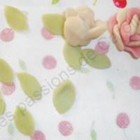 - J’étale la pâte d'amande verte (voir plus haut), puis je taille des ovales qui formeront les feuilles. Je marque avec le dos d'un couteau, les nervures. Je positionner les feuilles, éventuellement couper et coller des sépales autour de la feuille en nombre impair. Les roses sont prêtes à être utiliser.