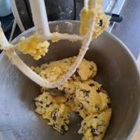 - Dans le bol du robot, je tamise la farine, la levure et la maïzena. Et je mélange quelques secondes à l'aide de la feuille puis j’ajoute le sucre en poudre, le sucre vanillé et le sel. Je mélange brièvement et j’incorpore l’œuf ainsi que le beurre détaillé en morceaux. Je râpe finement pour obtenir le zeste d'orange, et je l’incorpore, ainsi que le jus d'orange et les pépites de chocolat. J’amalgame Bien.