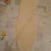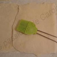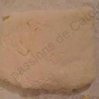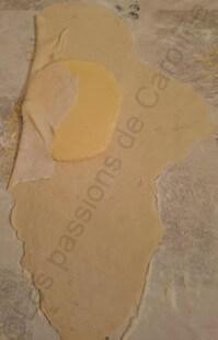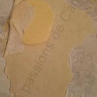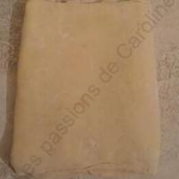 - Le tourrage : J’assouplis le beurre, entre deux feuilles de cuisson et je forme un carré de beurre de 20x20 cm. Je farine légèrement mon plan de travail, puis j’étends la détrempe sur 1 cm d'épaisseur, et je mets le beurre au milieu. Je rabats les quatre pans de la pâte pour l'enfermer comme une enveloppe. J’étendre la pâte au rouleau en une bande longue, étroite, régulière, que l'on amincit jusqu'à ce qu'on commence à apercevoir le beurre, puis je lui donne un quart de tour. Je plie en portefeuille, c’est dire que je rabats 1/3 de la pâte jusqu’au milieu, puis l’autre tiers de la pâte vers le milieu et je replie la gauche sur la droite. Je fais deux marques avec mon doigt pour indiquer que j’ai fait deux tours (ou double tours). Je lasser reposer 1h minimum .
