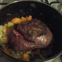 - J’épluche et coupe les légumes en morceaux. Je baisser le feu et ajoute les légumes dans la cocotte. Je fais revenir 5 minutes et saupoudre de farine. Je remue et mouille avec le vin rouge. J’ajoute le poivre, les clous de girofles, le laurier, l'ail et l'orange entière coupée en 4.